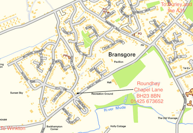 Leave the Wessex Way for Bournemouth Airport. At the small roundabout at Hurn, which has just two exits, turn right and go about two miles over the watermeadows and then cross the River Avon. Turn right and after half a mile you will go through Sopley. Ignore the sign left to Bransgore. Go another half a mile and in Winkton, on the crown of a right hand bend, turn left to Bransgore. Travel about two miles and you will see the Carpenters Arms pub coming up on your left. Best is to park in the pub car park (they are fine about this despite the sign about clamping) and walk round in front of the pub into Chapel Lane. Roundhay is the first drive on the right, with a wooden gate. Knock on the green front door with panes of glass to either side. |